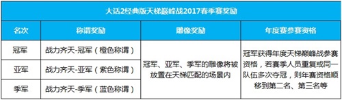 今晚19:00,大话2经典版天梯巅峰战2017春季赛总决赛火热开战,四支顶尖队伍齐聚一堂,高手过招,一较高下!淘汰赛的一部分积分将作为总决赛的初始积分,四支队伍进行3轮随机匹配遭遇战(已匹配过的对手不会再遇),每轮比赛结束后,根据天梯胜点总和进行即时排名,3轮比赛结束后,排出前1、2、3、4名,冠亚季军将获得限时称谓奖励、雕像奖励,冠军还可获得年度天梯巅峰战参赛资格!