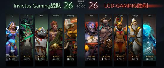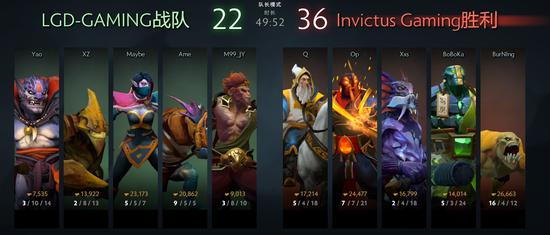 第三局背水一战的LGD拿出了昨天战胜VGJ的四保一水人体系,而IG选出了剑圣黑鸟发条大圣冰女的阵容。本场比赛完全是Ame的无解肥水人秀,LGD利用前期IG几次团战失误获得大量优势,加上水人无解的带线牵制能力,IG坚持了37分钟后就打出GG,14杀0死的水人帮助LGD扳回一城。