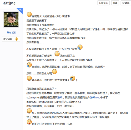 然而事情在昨日发生了逆转,有网友爆料星际2MOD作者其实并未死去,这一切只是个恶作剧。消息一出引发了众多社区网友的关注,在爆料人拿出聊天证据等“干货”后,最终事主“暮光之渊”浮出水面发布了一张道歉贴,证实自己依旧健在。