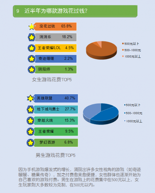 因为手机游戏爆发式的增长,涌现出许多女性视角的游戏(如奇迹暖暖、糖果传奇),加之付费愈来愈便捷,女性群体也逐渐开始为自己喜欢的游戏付费。男生在游戏上的花费集中在500元以上,女生玩家则大多数较为克制,在500元以内。