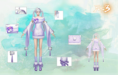 “灵心雪兔”女装与男装一样,同样由蓝、紫、白三色交融而成,但与男装不同的是,女装上不遮香肩,下不掩美腿,尽显了元气少女玲珑有致的优美身段。少女活泼俏皮的双马尾发型、头上的小兔子发箍和身后的圆球兔尾设计突显了少女的可爱灵巧。胸前和双臂垂帘袖口的雪球装饰,以及鞋上的蝴蝶结,又透露出一丝柔情。穿上“灵心雪兔”,就如同一位古灵精怪的童话公主从雪中走来,令人无法不倾心相待。