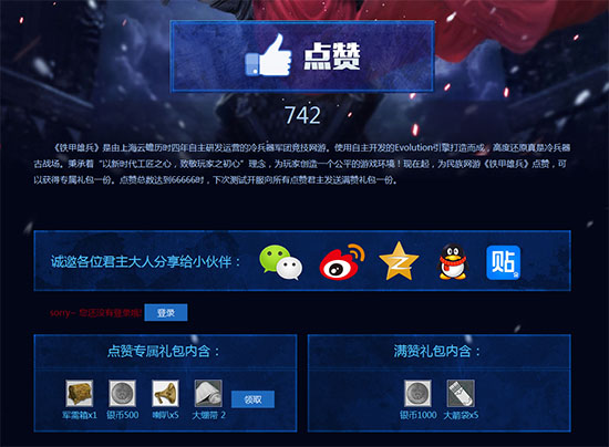 此外,玩家还可以通过微信、微博、QQ、QQ空间、贴吧分享点赞页面,邀请小伙伴们来一起为《铁甲雄兵》点赞。点赞总数达到66666时,所有点赞君主都将在下次测试开服获得满赞礼包一份,礼包中包含大箭袋x5、银币x1000。