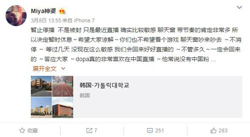 因为此前中韩关系比较紧张,而Dopa作为一个韩国人自然是身份也有些敏感的,所以当时米娅就表示由于特殊时期带节奏的人非常多,暂时决定暂停直播和Dopa先回到韩国去了