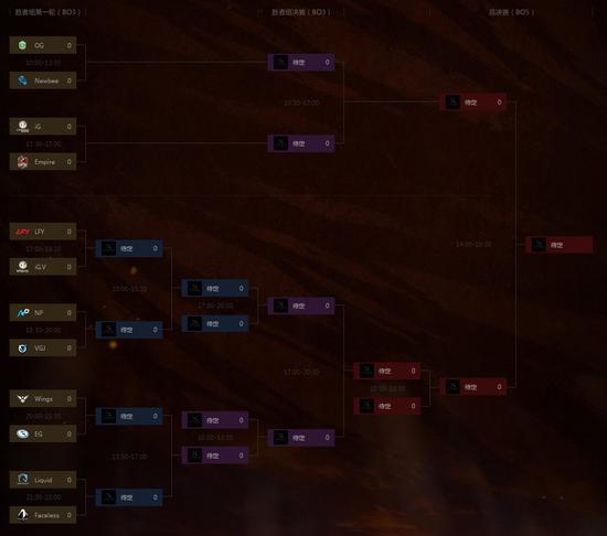 12支战队将根据小组赛成绩确认主赛事对阵,主赛事的对阵情况如下图,也可前往DAC赛事专题查看具体对阵及时间表。12支队伍在4天的双败淘汰赛中激烈角逐。胜者组4支队伍,败者组8支队伍。第一轮败者组为BO1,总决赛为五局三胜,其余均为三局两胜。