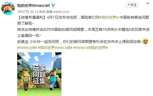 而随着官方将《我的世界》中国版发布会定档4月7日北京水立方,玩家对于游戏的讨论更是达到了空前的热度。近日,《我的世界》中国版官方微博就向冒险家们发起征集,了解玩家对于游戏的疑问和期待。小编对玩家最关注的六大问题进行了梳理,接下来就让我们一起来看看国内玩家最关心的问题究竟是什么。