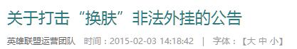 2015年2月3日,《英雄联盟》官网认定第三方插件中的“换肤”功能属于非法外挂,被检测出使用此类功能的账号会被系统封禁。