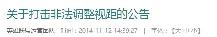 2014年11月12日,《英雄联盟》官网宣布调整视距属于第三方插件,并且破坏了游戏平衡,被检测出使用无限视距功能的账号会被系统封禁。