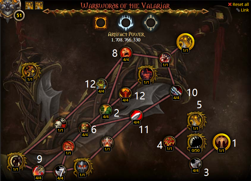 瓦拉加尔之怒(提高10%伤害10%耐力)→无匹之力(提高战吼内暴击伤害)→继续点新特质直到死亡与荣耀(新大特质)→狂怒斗士(提高激怒伤害加成)→愤与怒(提高怒击伤害)→势不可挡(提高暴怒伤害)→死亡执行者(提高斩杀暴击率)→狂野挥砍(提高狂暴斩击伤害)→不羁怒火(提高冲锋怒气获取)→其他功能性特质→巅峰。