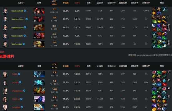35分钟OG开雾,在野区抓到拉比克后直接打盾,NB在先手秒掉谜团的情况下被黑鸟后手切入大招打出爆炸输出,团灭之后OG带盾,而Newbee阵容再无一战之力,中路被破后直接打出GG。