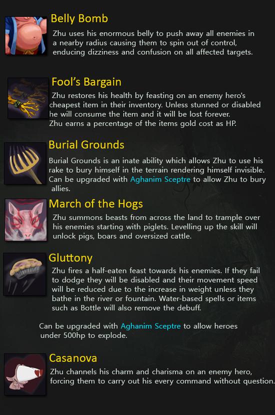 猪八戒将会吞食敌方英雄身上最便宜的物品,根据物品的价格百分比回复相应的血量。被吞食的物品永久消失。