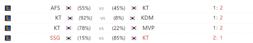 在昨日LCK稍晚进行的一场比赛中,KT在先失一局的情况下,最终以2-1的比分逆转战胜了AFs战队,结束自己三连败的同时也确定了常规赛第三的成绩,他们将在季后赛第一轮迎战AFs与MVP之间的胜者。