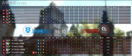 古堡激战这张地图可以说是Tyloo除了Mirage以外的最强图了,尤其在进攻端,多变的战术套路和干净利落的破点,让他们在这张地图上很少失利。比赛开始后VG先行进攻,并在半场结束时仅以一分之差落后,然而下半场双方易边之后场上风云突变。Tyloo展现了他们强大的进攻能力,让VG在下半场仅拿到3分,最终以16:10先下一城。