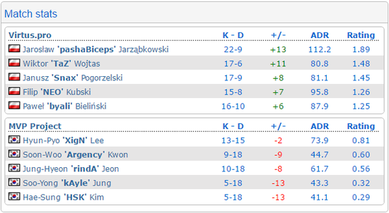 MVP拿到CT方,手枪局VP对A区佯攻,但MVP的防守阵型没有被拉动,依旧是3人重防B区,随后强攻B区的波兰人依旧凭借枪法打下包点并成功下包,但无奈血量不足,MVP成功回防,并顺利拿下接下来的经济局取得3:0领先。