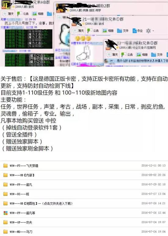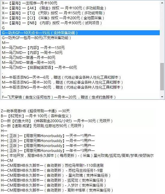 知情玩家透露,中国市面上流行的《魔兽世界》外挂的源代码多来自德国兄弟外挂,在某声称为德国兄弟外挂官方论坛中,我们可以看到在售的《魔兽世界》外挂有将近50种,根据功能的不同价格从每月6元到每月300元不等,其中深受玩家痛恨的飞天穿墙挂每月只需20元,而声称每小时可以刷2000金币的钓鱼外挂每月只需30元并支持无限多开,速刷威望90元、1-110级挂机速成35元、全材料自动挂机采集45元……数十种名称不同功能各异的外挂让小编看花了眼。