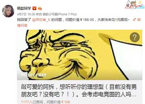 正所谓“窈窕幼女,君子好求。”骆歆自从登上LPL的解说台,便俘获了不少骚年的芳心。近日便有粉丝通过微博向问答,希望知道骆歆的理想型男友是什么样的。可万万没想到这个问题竟然牵引出了两位骆歆的隐藏爱慕者!