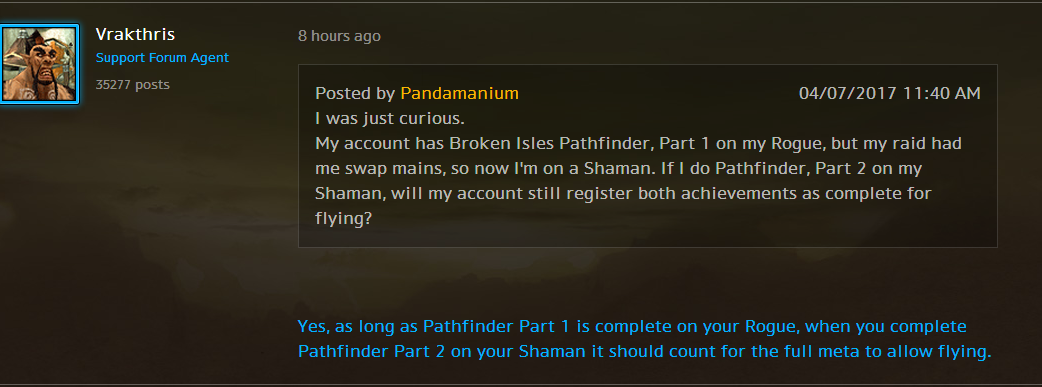 Q:我很好奇,我的账号之前用盗贼完成了破碎群岛探路者第一章,后来团本需要,我换成了萨满。如果我的萨满完成了破碎群岛探路者第二章。我的账号还算完成了飞行的要求吗?