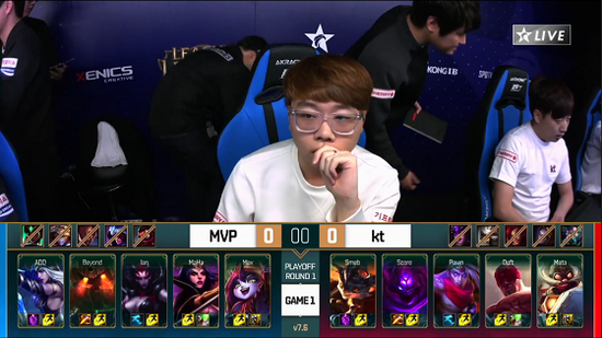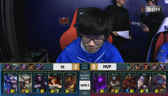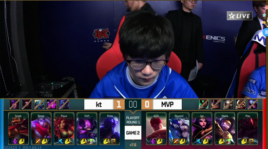 比赛开始,MVP的盲僧gank下路但是被Score男枪蹲到,盲僧被拿一血。之后KT下路Mata与Deft频频被机器人控到,MVP掌握了比赛的节奏。