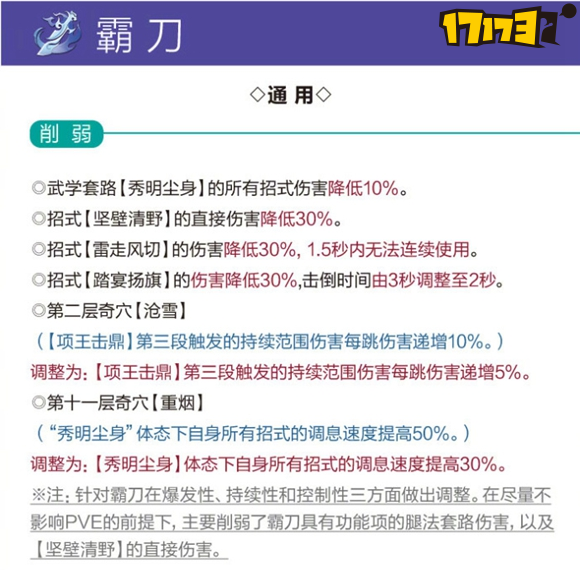 在本次技能改动中,霸刀是属于被削弱的比较厉害的一个门派,主要输出技能均被削弱,但是相对于他之前的超一线DPS,本次技改使他的DPS回归到了一线DPS的水平线。