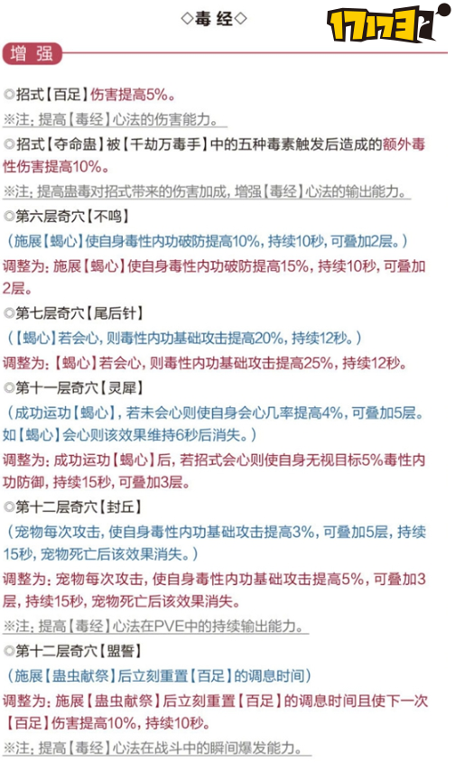 在本次技能改动中,毒经加强了大部分输出技能,并且优化了部分辅助技能的效果,提升较为明显,但是相对于之前的三线DPS,提升一般,打出一个高DPS仍然需要大量精简装备支撑属性。