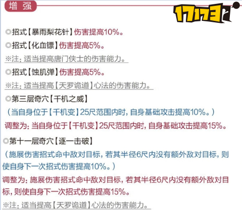 在本次技能改动中,增强了天罗自身增益技能的效果,提升了大部分输出技能的伤害,相对于之前的三线DPS,提升一般,打出一个高DPS仍需要特定BOSS。