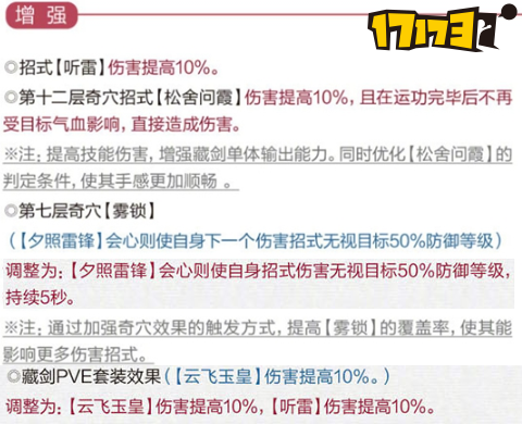 在本次技能改动中,藏剑的核心增益buff得到了提升,套装效果也得到了优化,增强了主要斩杀技能和常用技能的伤害,相对于之前的三线DPS,提升很大。