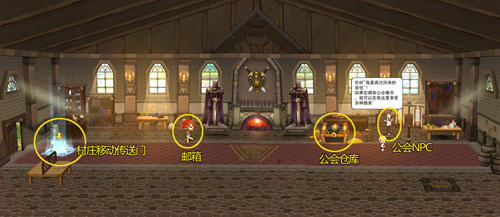 *各村庄公会旗帜处生成NPC美优,该处的NPC拥有进入公会领地、服务、任务和公会公告按钮;