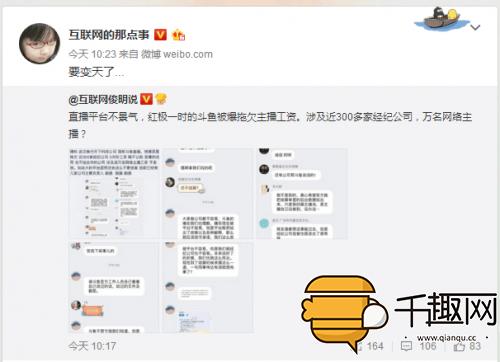 4月14日消息,今日,微博用户@互联网俊明说发布了一条消息,消息中指出直播平台不景气,红极一时的斗鱼被曝拖欠主播工资。涉及近300多家经纪公司,万名网络直播?,并附上了几张图片。这条微博发出后,被@互联网的那点事转发,这则消息在直播行业引起了不小的轰动。