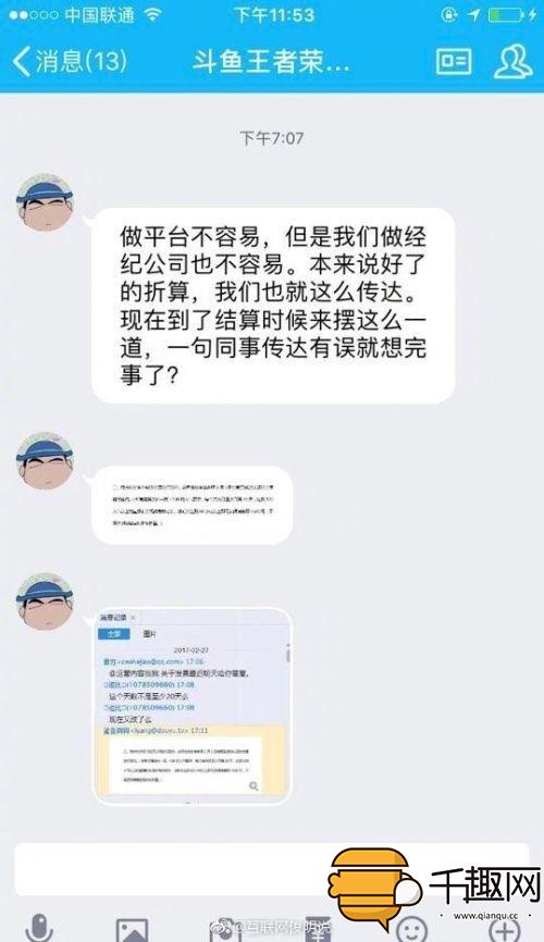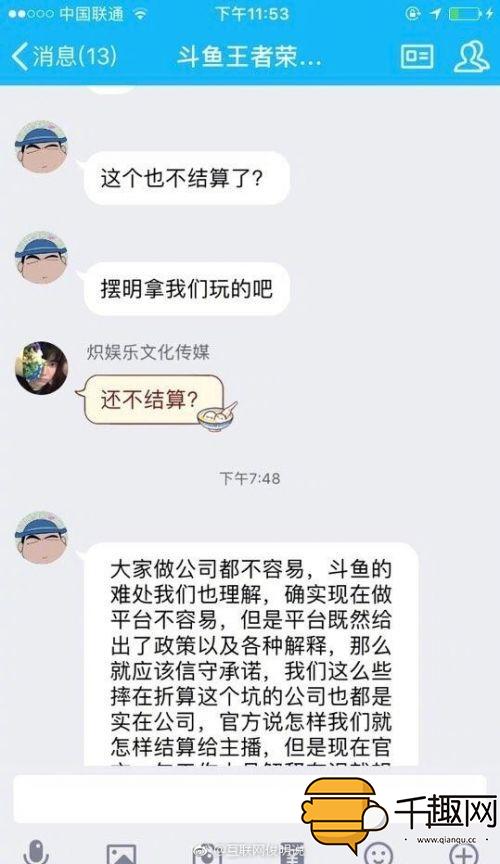 从@互联网俊明说上传的图片上显示,武汉斗鱼行天下科技公司,简称斗鱼直播。惊爆而已拖欠近300家经纪公司3月份工资,概不认账。签署的合同,也不给合作的公司。涉及近万名网络主播工资,不发放。