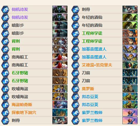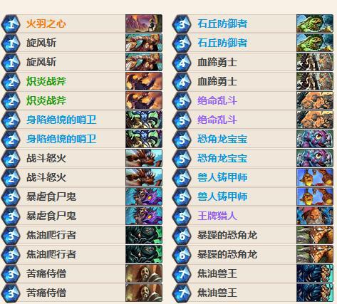 在新版本初期虽然海盗战依旧强势,但是任务体系的战士卡组却以海盗战克星的身份出现,大量的嘲讽生物让快攻卡组很难找到直接攻击英雄的机会,而进入对战后期每回合1次随机打8的超强英雄技能更是让很多后期卡组都很难与之抗衡,如果你是一名偏向于控制且执着于战士的玩家,那么火羽之心以及一系列勇闯安戈洛的嘲讽卡牌将是你在新版本中驰骋天梯的最好帮手。