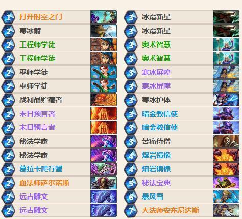 在集齐双巫师学徒+双熔岩镜像之前你需要利用远古雕文、秘法宝典、暗金教信使等卡牌来寻找你套牌之外的额外法术,同时利用末日预言者+冰霜新星的COMBO来尽量拖住回合数,再配合工程师学徒、战利品储藏者、奥术智慧等过牌手段迅速集齐关键牌,从而尽早的开启无限火球模式。总的来讲任务体系的法师是一套偏向于OTK玩法的卡组,在新版本初期的胜率也较为稳定,是任务体系中较为常见的卡组之一。