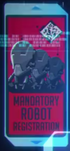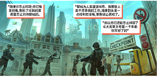 那么国王大道事件的导火索是什么呢?应该就是“解密”档案中透露的:“强制机器人登记”事件。从漫画中我们可以看到,这个“登记”是非常不友好的,所有智械要“接受扫描”(招牌下面小字),想必是这一点激化了极端派智械与人类的矛盾。