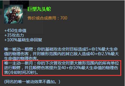 而虎神出巨型九头蛇还有个终极丧心病狂的杀人套路,那就是A眼暴击杀人!仔细看看巨九的主动,只要有3000血量一下平A能打340伤害,而这个效果无论A小兵还是A眼都能触发,这在没有Q时简直是武器AOE杀人神技!