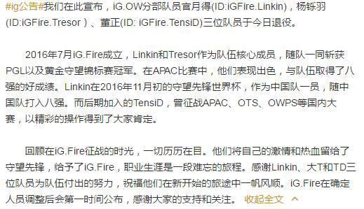 我们在此宣布,iG.OW分部队员官月得(ID:iGFire.Linkin),杨铄羽(ID:iGFire.Tresor)、董正(ID: iGFire.TensiD)三位队员于今日退役。