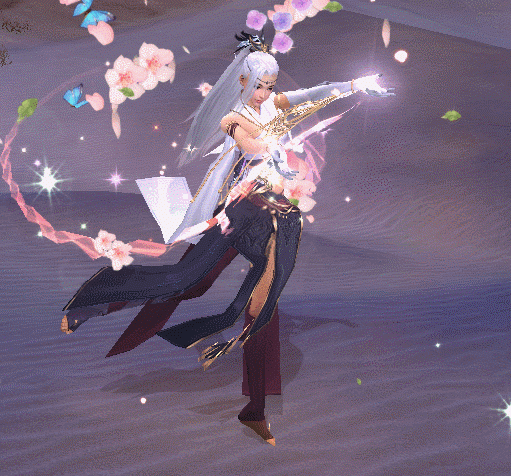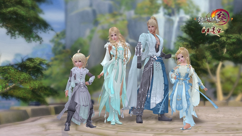 特效外装“月凝清宵”,女装采用一体式剪裁设计,梦幻唯美,仙气十足;男款则是一身华美暗纹的劲款装束,并特别设计了缎带元素。使用交互动作后,成男正太会展示吟诵《侠客行》的动作表现,而成女萝莉则会与蝴蝶飞花浪漫共舞。
