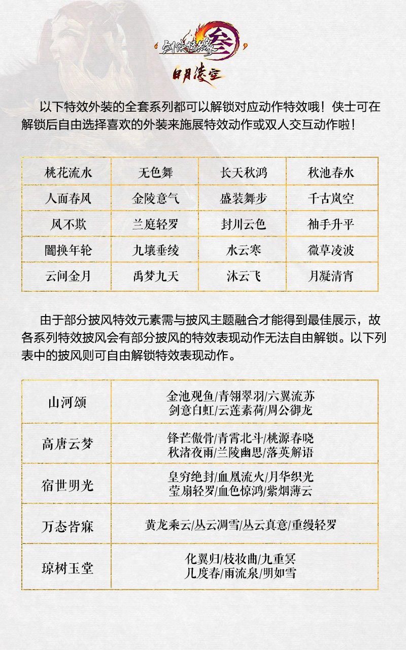 侠士获取特效外装或特效披风后,只需将其装备在身上,即可自动解锁对应的特效表现动作,此时无论侠士更换任意一套外观均可自由施展动作,不再收到外装的约束。想穿沧海间来个公主抱?没问题!“日月凌空”资料片中可解锁动作特效的详细外观信息详见下图哦!