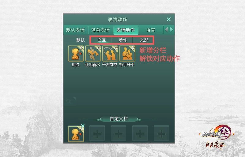 侠士也可通过动作表现界面查询对应的特效外观和解锁信息,并可将已解锁的特效动作设置到交互动作快捷栏中方便使用。
