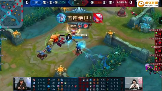 在16日AG超玩会对阵JC的第一局比赛中,JC战队的队员DangLang所使用的诸葛亮率先用大招击杀AG超玩会的兰息,随后是梦泪、流苏,完成了三连决胜。就在JC打算撤退之际,AG超玩会的关羽绕后利用大招进场被JC四人瞬间打残,DangLang成功拿下四连超凡。而此时AG超玩会最后一名队员老帅想要撤退已经为时已晚,被DangLang追上一个1技能收掉完成五杀,拿下2017KPL常规赛第一个5杀!