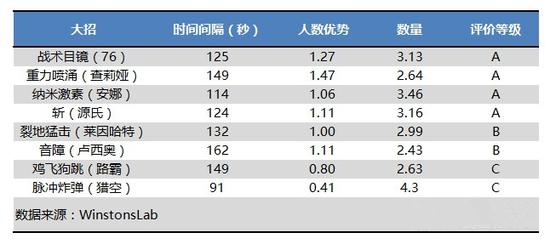 时间间隔是指,通过充能积攒出大招所需要的平均时间。数量是指,在一次完整的作为进攻方的回合中(平均大概6.5分钟),所打出的大招的平均数量。评价等级当然就是这个大招在守望中的实用程度了。