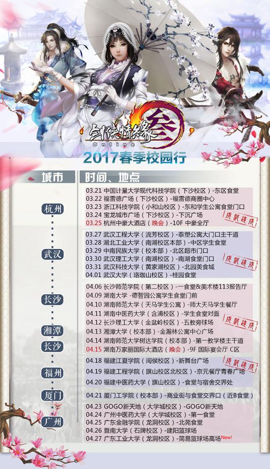 自3月21日至今,历时月余的2017《剑网3》春季校园行已惠泽杭州、武汉、长沙、湘潭、福州、厦门六大城市的莘莘学子,广州站作为收官之站,不容错过。