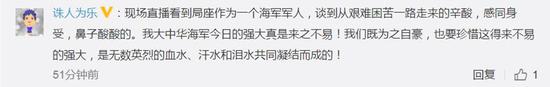 微博截图局座的眼泪并不是单纯为人民海军的“苦”和“难”而流。泪水里固然有对于艰难前行岁月中所承受的压力再一次释放,更多的则是饱含看到中国海军大好局面的欣慰。局座在直播活动中以非常肯定的语气告诉所有人——中国海军已经是世界第二!