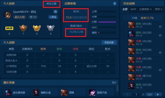 从西瓜的战绩可以看到,他基本主玩打野,而胜率更是达到了恐怖的75%。从他高达15.6的KDA以及常用英雄就可以看出他的风格会偏团队,就是属于那种润滑剂型队友,没有他团队基本就运转不了,所以这也算是西瓜能快速上分的诀窍了。