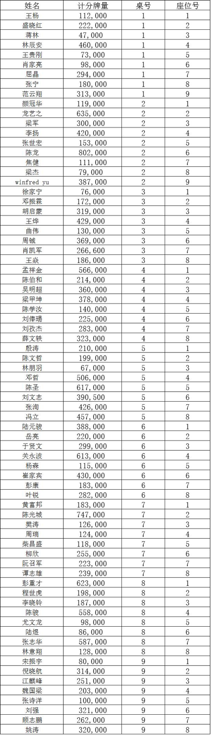 凌晨12点整,裁判宣布Day2的比赛结束,尽管奖励名单没有产生,但玩家们脸上都带着笑意,兴致勃勃的将计分牌封带,等着明天回来再战!我们来看下晋级选手的名单和计分牌情况: