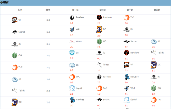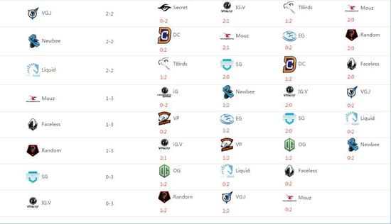 根据规则,2只3-0的战队将对阵0-3的战队,而3-1的战队的对手则是那三只1-3的队伍们,2-2比分的队伍们相互厮杀。本次瑞士轮赛制是第一次使用于DOTA2的比赛中,虽然小组赛并不淘汰,但好的成绩可以使队伍在接下来的比赛中相对轻松。具体淘汰赛对阵如下: