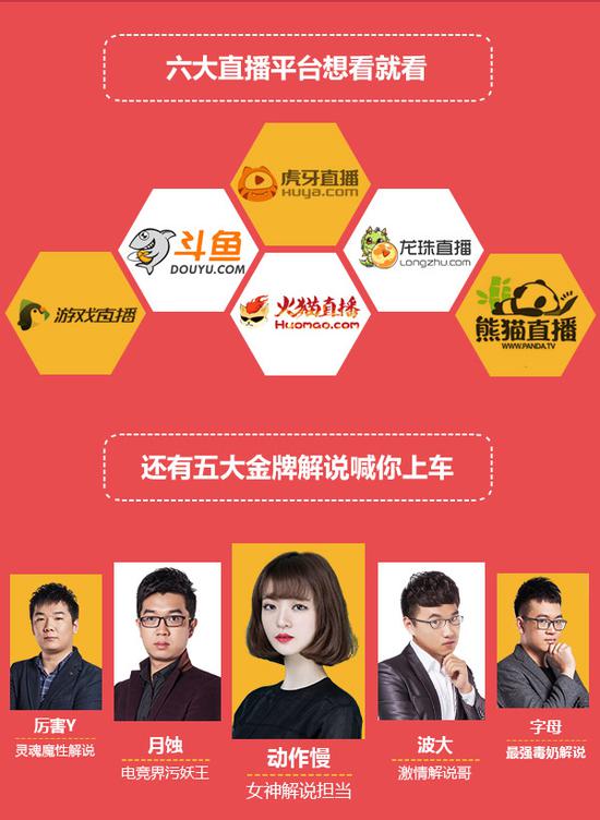 精彩赛事需要配合“毒舌”解说食用效果更佳!《英魂之刃》“最强毒奶解说”字母、“直播车王”月蚀等五大金牌解说坐镇直播间,斗鱼、虎牙、火猫、龙珠、熊猫多家平台联合直播,玩家只需进入对应平台搜索“英魂之刃”即可观看。