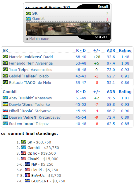 DOTA圈著名的The Summit巅峰联赛同款,首届CS_Summit巅峰联赛于北京时间今晨结束了全部战斗,SK在决赛中以3-1(SK作为胜者组冠军有一分优势)战胜Gambit夺冠,这也是巴西队在2016年ESL One Cologne之后夺得的第一个线下大赛冠军!