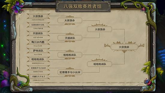 胜者组决赛在“大侠饶命”和“哇啦啦”战队间展开,胜者将能够锁定一个前往夏威夷旅游的名额。第一回合是一局萨满内战,“哇啦啦”的萨满在嗜血的效果下并没有很顺利的带走“大侠饶命”,面对对方成长起来的青玉,无力对抗,然而在最后时刻依靠摇出的法强图腾配合法术直接打脸击败了“大侠饶命”的萨满,上演了一场天选之人的比赛。第二回合,“哇啦啦”的猎人无法解掉“大侠饶命”萨满的优质随从,占据不了主动,双方打平。第三回合“哇啦啦”的海盗战不敌“大侠饶命”的青玉德,在双升级的武器被软泥怪解掉之后,迅速认输。决胜回合,“大侠饶命”起手便打出海盗杀手蟹,“哇啦啦”战队的海盗战被直接针对,无奈放弃了抵抗。这样,“大侠饶命”战队成功晋级决赛,锁定了一个夏威夷双人游的资格!