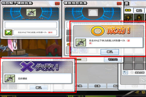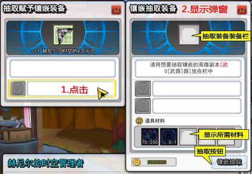 3、镶嵌抽取会消耗稀有等级英雄装备、时空的结晶、精致时空的结晶等材料。成功后,赫尼尔时空4次元装备将随机获得英雄装备[英雄效果]中的一种属性。镶嵌抽取有可能失败,道具和材料会消失。