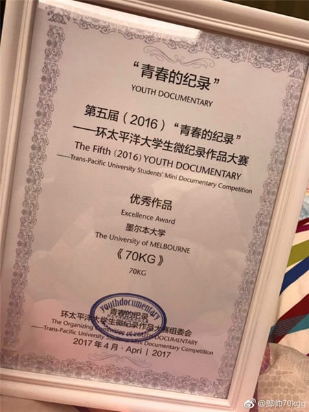 金瑞秋:大家好,我是金瑞秋,94年的女生,去年从清华大学新闻与传播学院毕业,现就读于墨尔本大学法学院。纪录片《70KG》是我的本科毕业作品,这个片子是由马四饼、韩天以及我共同完成的。
