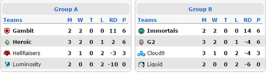 与B组实力接近的情况不同,A组晋级情况相对明朗,Gambit两战全胜率先晋级,Heroic紧随其后,Hellraisers和Luminosity被淘汰。