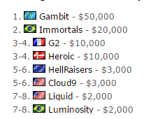 淘汰赛采用BO3单淘赛制,Gambit以两个2-1先后击败G2和Immortals夺得冠军,巴西二哥获得亚军,G2和Heroic分获三四名。最终排名及奖金分配如下: